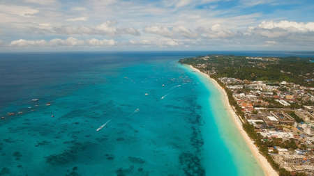 Tropical white sand beach, hotels near the blue lagoon and corall reef. aerial view, Boracay, Philippines. Seascape with beach on tropical island. Summer and travel vacation concept.