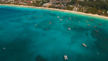 Tropical lagoon with turquoise water, sailing yachts and white sand beach from above. Boracay, Philippines. White beach with tourists and hotels. Summer and travel vacation concept.