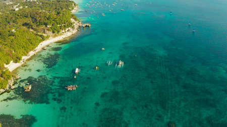 Aerial seascape: Tropical beach with palm trees and turquoise waters of the coral reef, from above, Puka shell beach. Boracay, Philippines. Seascape with beach on tropical island. Summer and travel vacation concept.