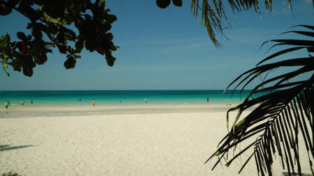 Tropical beach with tourists and clear blue sea through palm branches. Summer and travel vacation concept. Boracay, Philippines