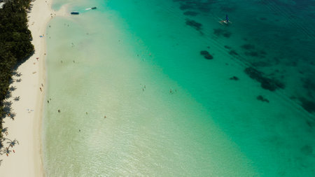 Tropical beach with white sand and palm trees, view from above. Turquoise lagoon with a sandy bottom. Beach of the island of Boracay, Philippines.