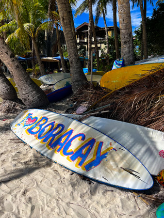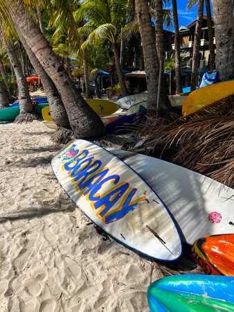 BORACAY, PHILIPPINES - FEBRUARY 28, 2018: View of the sandy beach. Copy space for text