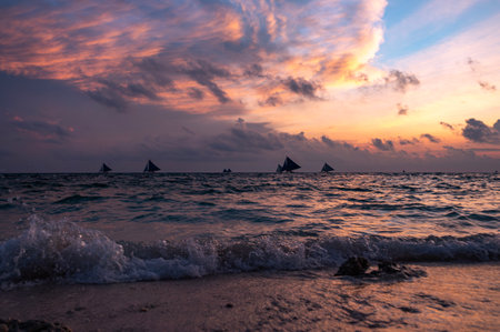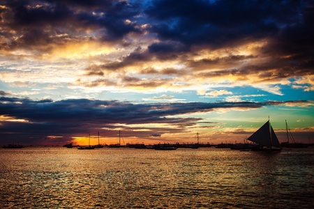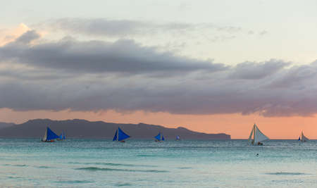 Sailing yachts on the sea surface at sunset, aerial view Boracay, Philippines. Sunset over ocean. Seascape, Summer and travel vacation concept