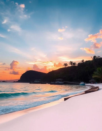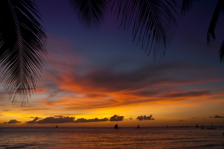 Beautiful tropical beach with palm trees and sailboats at sunset.