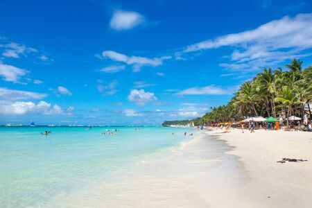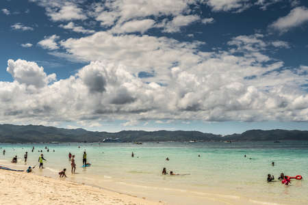 Balabag, Boracay Island, Philippines - March 4, 2019: White beach shows sand and azure sea with Malay Island in distance. People in water. Cloudscape in blue sky.