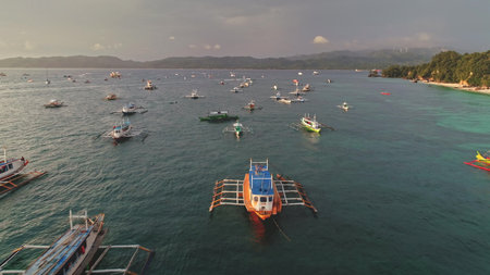 Aerial drone showing many colorful bangka boats crowding the sea near Cagban Beach, Boracay Island, Philippines, with the coast visible in the background
