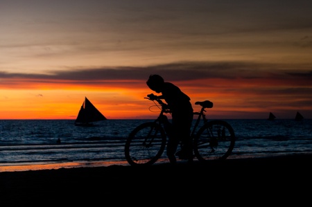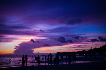 Silhouetted people and palms near sea. Sunset at tropical White beach, Boracay island, Philippines