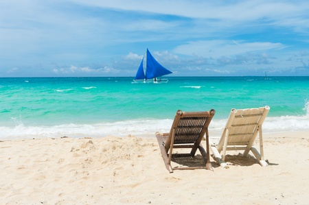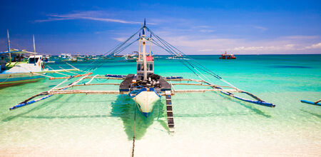 Boat at the white beach with turquoise water in Boracay, Philippines