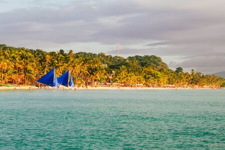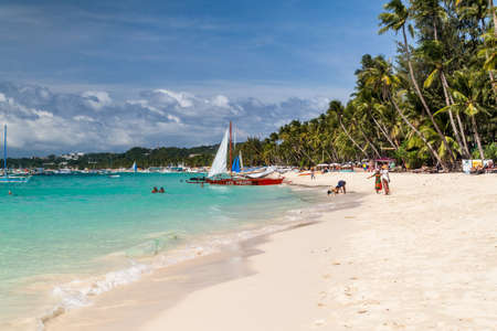 Tropical lagoon with turquoise water and white sand beach Boracay, Philippines. White beach with tourists and hotels. Tropical white beach with sailing boat.