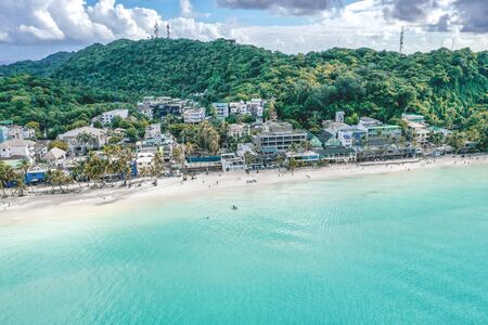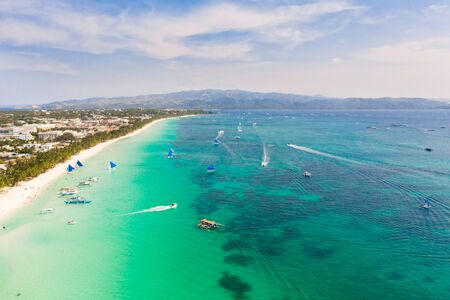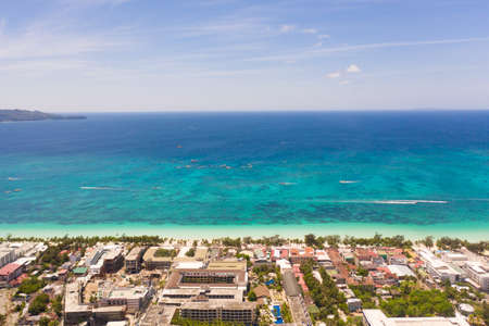 White sandy beach with tourists and hotels in Boracay Island, Philippines. aerial view. Seascape with beach on tropical island. Summer and travel vacation concept.