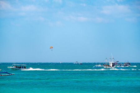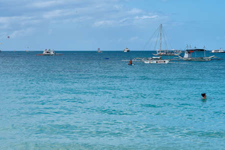 View of a beach and the sea of Boracay island in Philippines with many boats and tourist