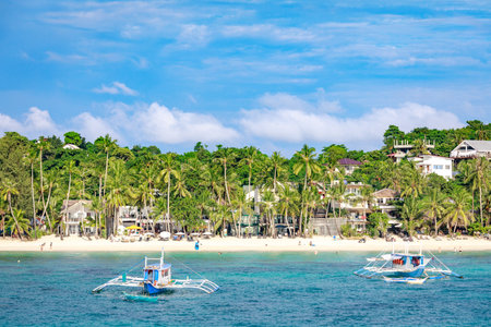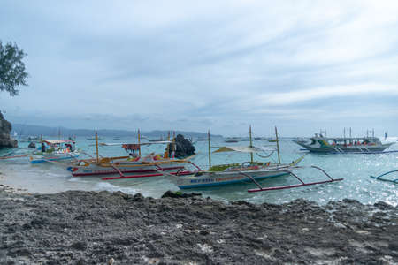 traditional paraw sailing boats on white beach on boracay island, Philippines