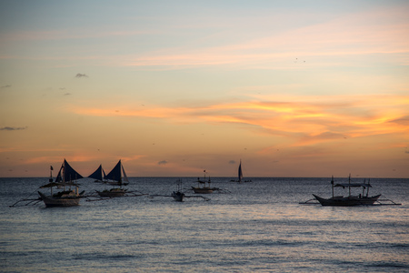 Evening sunset of the sea with ships on the water. Malay, Philippines