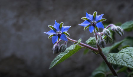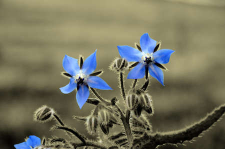 Borago officinalis borage flowers on sepia background. Traditionally borage was cultivated for culinary and medicinal use, today, Although commercial cultivation is mainly as an oilseed.