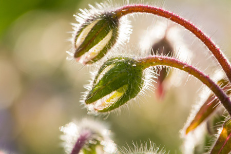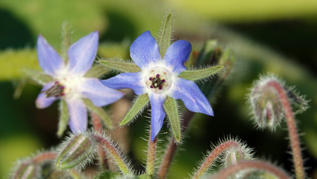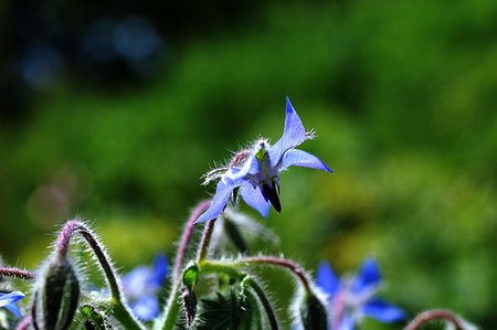 Borage flowers and buds (Borago officinalis) in the back light, in front of green nature with bokeh and plenty of copy space