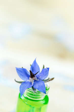 bottle of Organic borage essential oil. dry product spread on a blur background