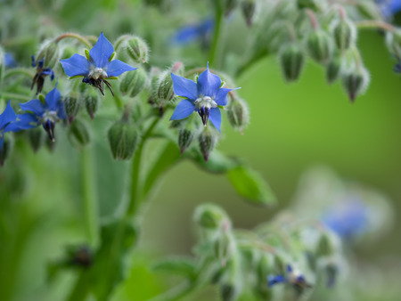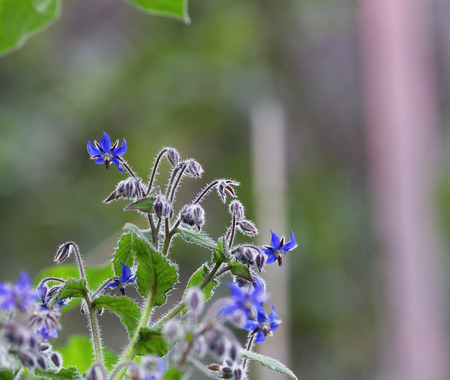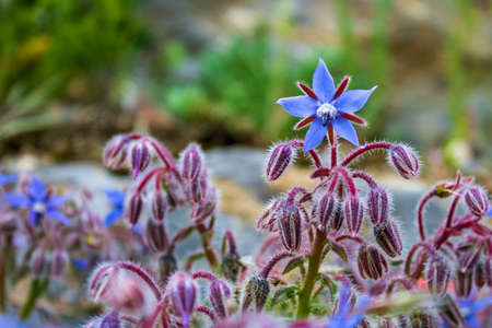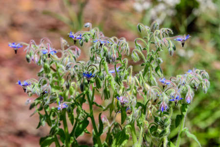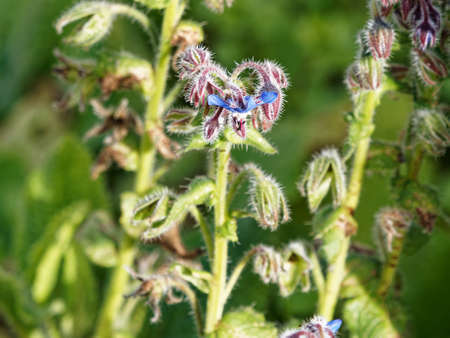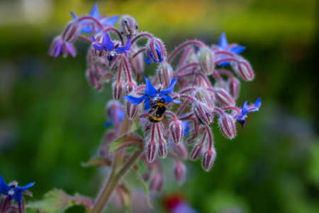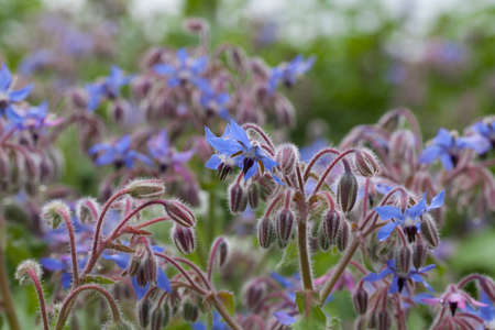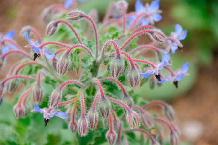 Beautiful flowers of borage, a herb that blooms in the spring in the garden.