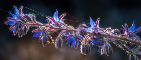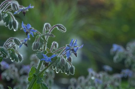 Blue, borage flowers glow in the sunlight of a summer morning.
