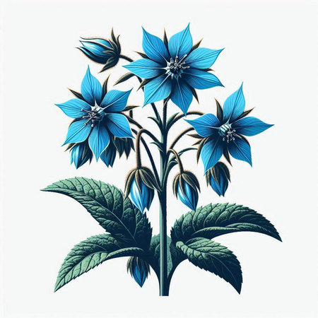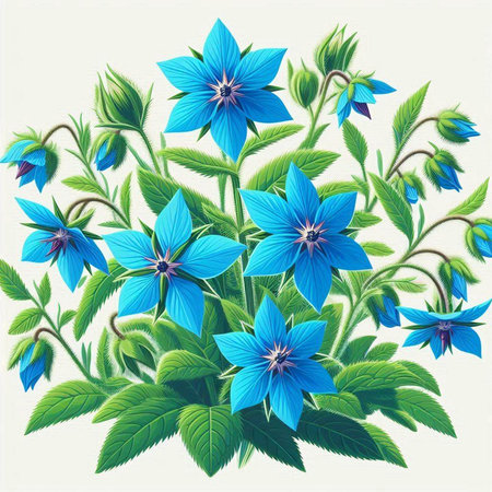 Borage flowers and leaves isolated on white background. Vector illustration.