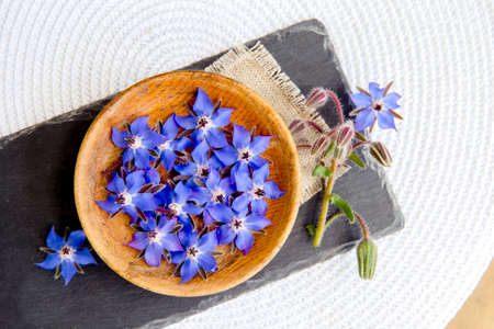 A bowl of blue borage flowers on the table. Farming season, alternative medicine