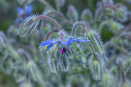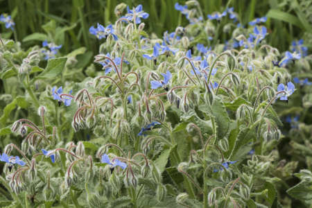 Borage ( Officinalis ) flowers. Boraginaceae Herb and edible and medicinal. The whole plant is covered with white hairs, and star-shaped Madonna blue flowers bloom April to June.