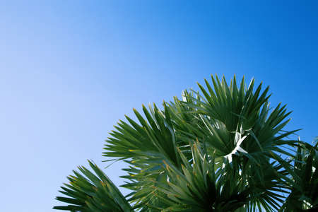 Tropical scene, Plam tree leaves on bright blue sky