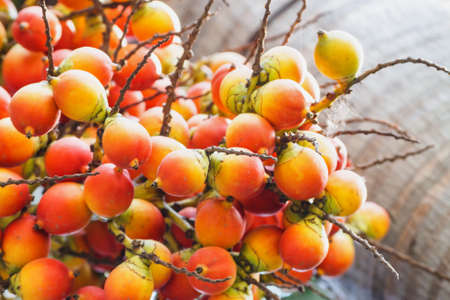 Betel nut palm tree with red fruits on natural tropical Koh Samui island in Surat Thani Thailand.