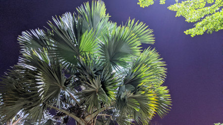 Upward view of a large palm tree with lush green fan-shaped leaves against a dark night sky. The leaves are illuminated by artificial light, creating a striking contrast. Bismarckia nobilis.