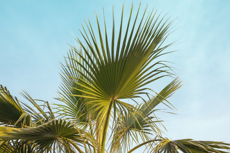 Palm tree with green leaves against the blue sky, closeup