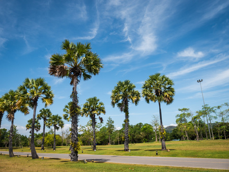 sugar palm tree and green field with blue sky