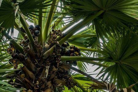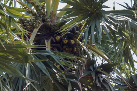Part of sugar palm tree with palmyra fruits and green leaves