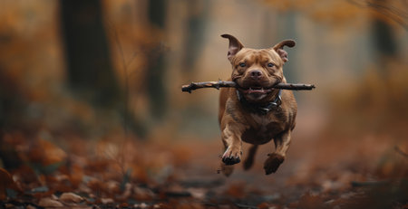 Adorable American Staffordshire Terrier running with a stick in the autumn forest