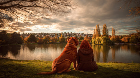 Young couple in autumn park sitting by the lake and looking at sunset