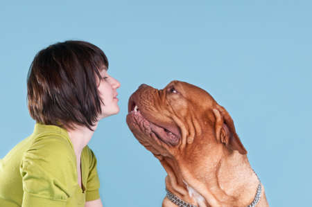Dogue de Bordeaux or French Mastiff with young woman at outdoor park meadow