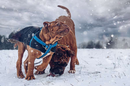 Dog Bordeaux dog in snow winter day