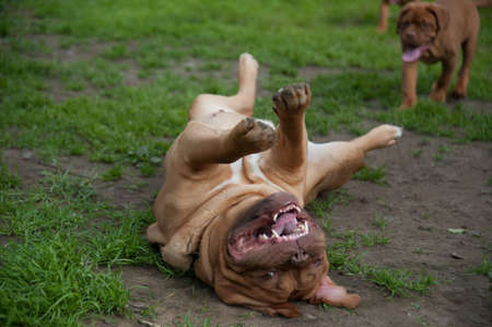 Dogue de bordeaux on the back in the garden
