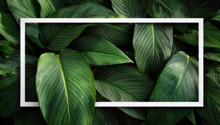 Spathiphyllum cannifolium concept, green abstract texture with white frame, natural background, tropical leaves in Asia and Thailand.