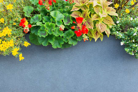 Arrangement of geranium, coleus and cinquefoil flowers on a gray background