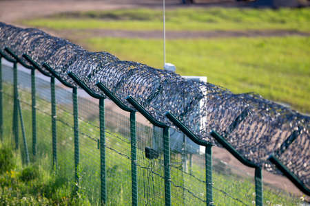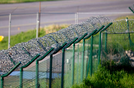 Fence with barbed wire. Concertina wire atop a fence protect in the nature.