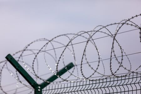 Security with a barbed wire spiral wound on the fence on a cloudy day