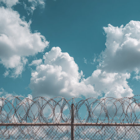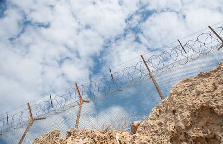 Barbed wire fence with cloudy sky background. Concept of freedom and security.