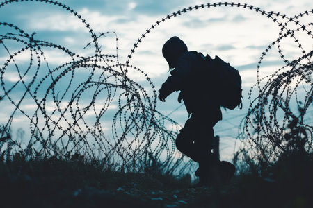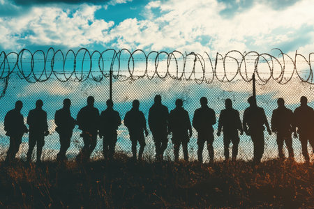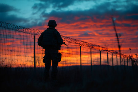 Silhouette of a soldier guarding a perimeter fence at sunset with a dramatic orange sky