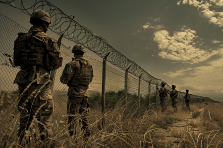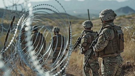 Monitoring Borders: Armed Forces and Border Patrol Address Immigration Security Issues. Concept Immigration Security, Armed Forces, Border Patrol, Monitoring Borders, National Security