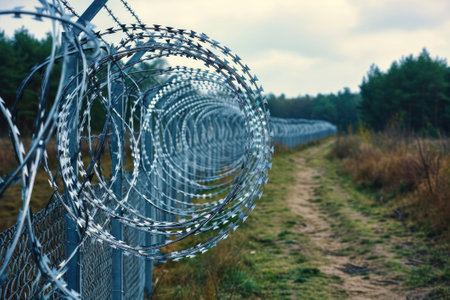 Close-up view of four horizontal strands of barbed wire. On a blurred nature background, AI Generated.