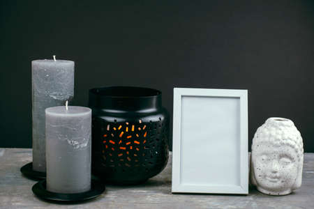 close up details of the interior of the room with a black wall, gray candles , ceramic Buddha head statuette and a white empty photo frame