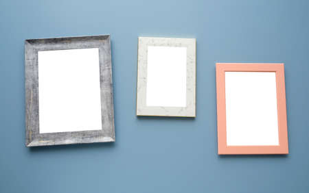 Minimal background image of graphic empty frame on pastel blue wall, picture mock up