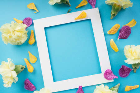 Mock up white frame with flower petal over bright blue background. Top view.