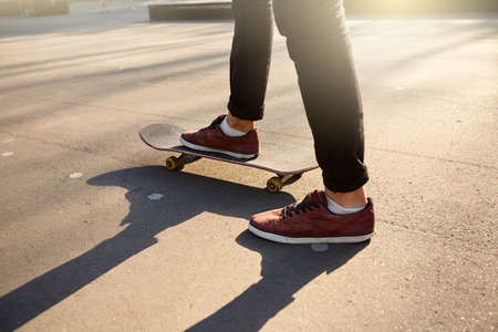 Close-up of skateboarders feet while skating in skate park. Man riding on skateboard. Isolated view, low angle shot.