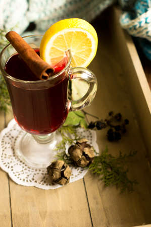 mulled wine with spices, sweets and orange on a wooden table