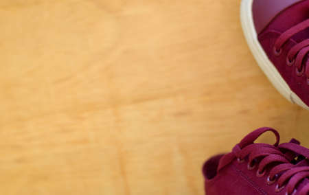 Close up a red sneakers isolated on wooden background. Put your text design